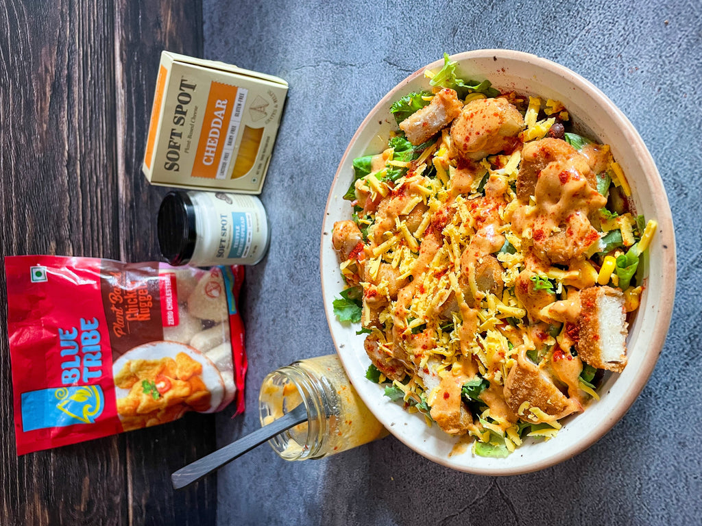 - Add the salad leaves, sweetcorn, tomato, and black beans to a bowl. Fry 1 pack of Blue Tribe Plant Based Chicken Nuggets and slice into halves.